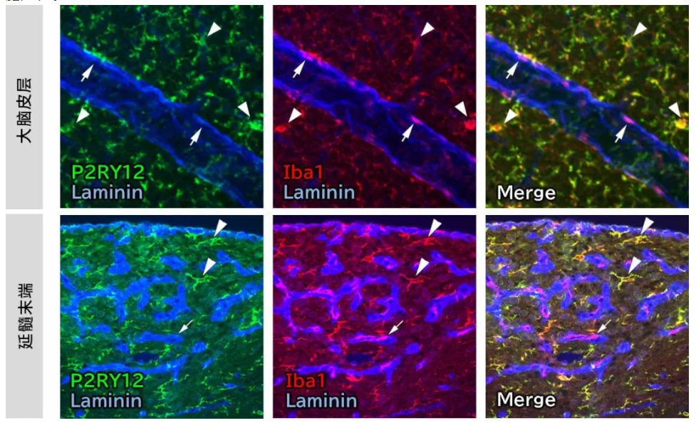 P2RY12(也稱(chēng)為P2Y12)是一種腺苷5'-二磷酸(ADP)受體,也是嘌呤能G蛋白偶聯(lián)受體P2Y家族的成員。它在外周組織的血小板中表達(dá),也在中樞神經(jīng)系統(tǒng)的穩(wěn)態(tài)小膠質(zhì)細(xì)胞(Homeostatic Microglia)中特異性表達(dá)。由于P2RY12幾乎不在巨噬細(xì)胞中表達(dá),所以它是用于區(qū)分存在腦血管周?chē)木奘杉?xì)胞和小膠質(zhì)細(xì)胞的有效標(biāo)志物1)。此外,ADP可用作細(xì)胞損傷的信號(hào),小膠質(zhì)細(xì)胞中的P2RY12被認(rèn)為在接收神經(jīng)細(xì)胞損傷方面發(fā)揮作用。