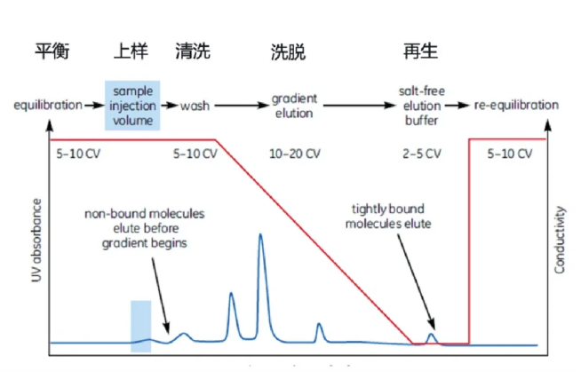 離子交換層析是基于蛋白質(zhì)和離子交換層析介質(zhì)之間的電荷相互作用進行分離。離子交換層析介質(zhì)通常帶有正或負電荷,吸附帶有相反電荷的蛋白質(zhì)。通過調(diào)整緩沖液的離子濃度或pH值,可以改變蛋白質(zhì)與介質(zhì)的結合強度,實現(xiàn)不同蛋白質(zhì)的分離。